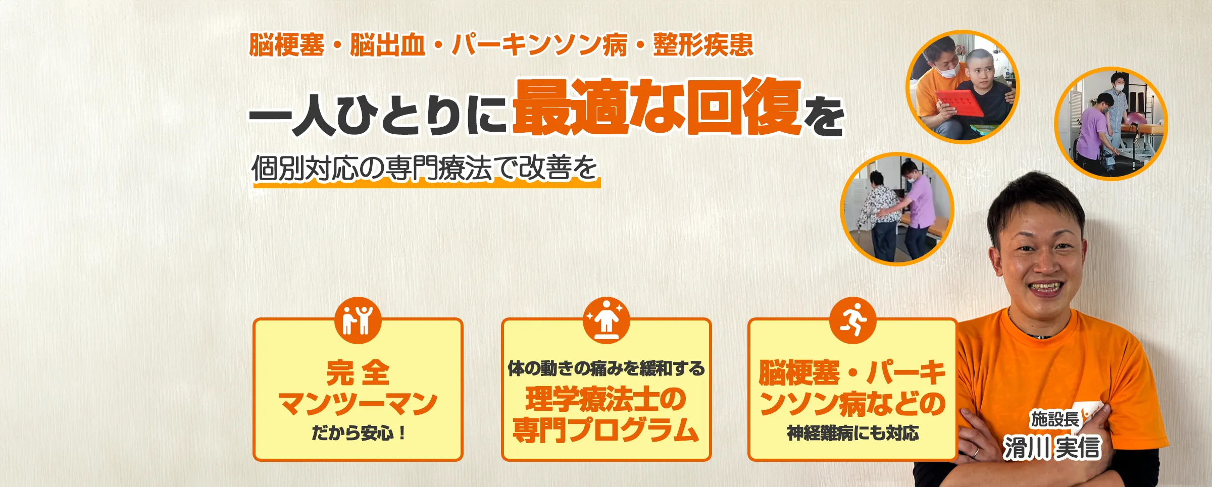 リハビリは、病気で何らかの障害が残った方を対象としたサービスです。障害により生活しづらくなり、それが長引くと体の他の部分にも影響が出て、痛みや動きの悪さなどの二次的な問題を引き起こすことがあります。ぜひ一緒にリハビリをして、体の動きが良くなる喜びを体験しましょう😊